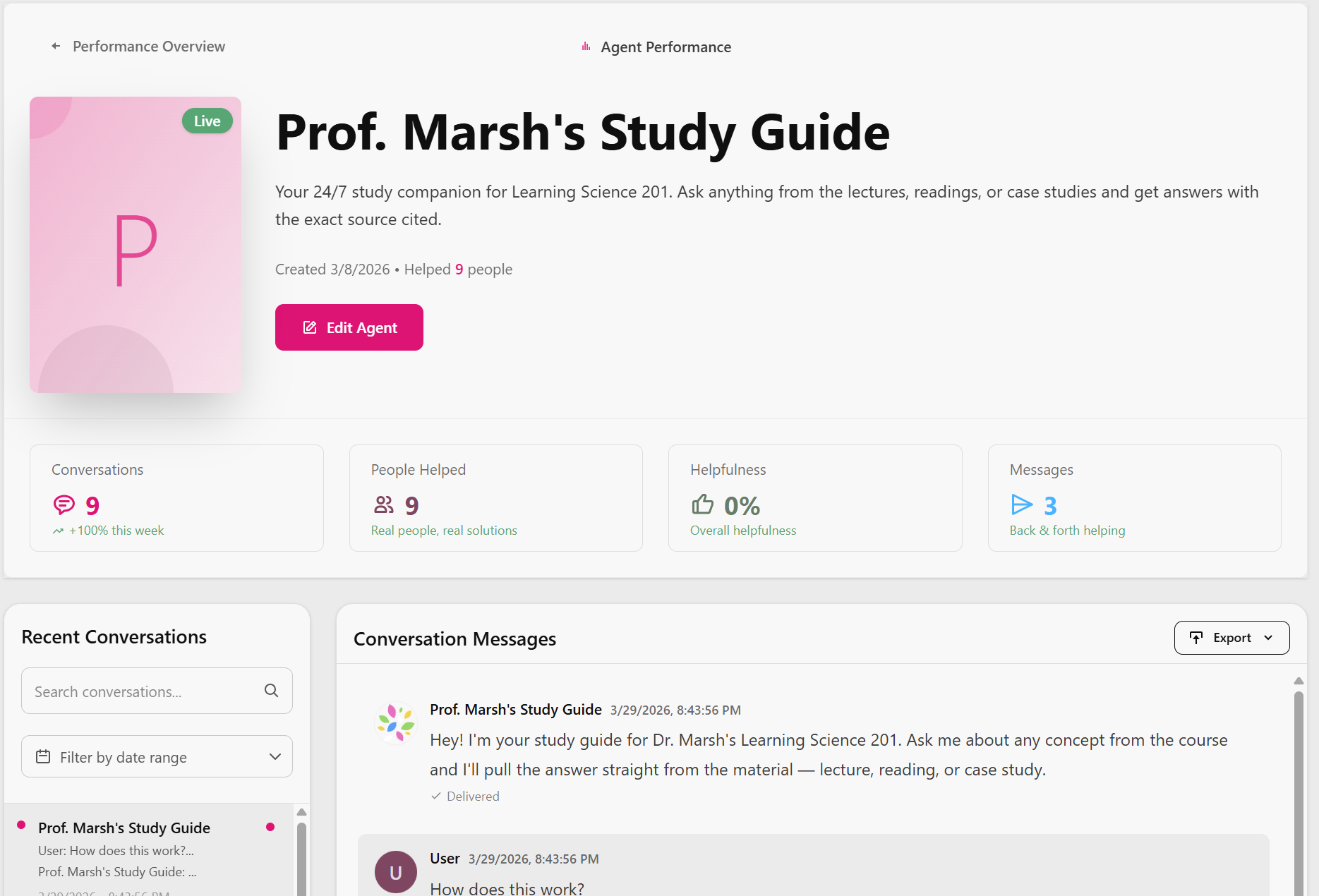 Copy one embed snippet onto any page. Your agent goes live immediately. Track every conversation, question, and pattern in your analytics dashboard.